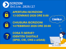 Le domande di iscrizione on line devono essere presentate a partire dalle ore 8:00 del 13 Gennaio 2026 alle ore 20:00 del 14 Febbraio 2026. Si potrà accedere al portale dedicato https://unica.istruzione.gov.it/it utilizzando le credenziali SPID (Sistema Pubblico Identità Digitale), CIE (Carta Identità Elettronica) CNS (Carta Nazione dei Servizi) o eIDAS (electronic IDentification Authentication Signature), senza effettuare ulteriori registrazioni.
