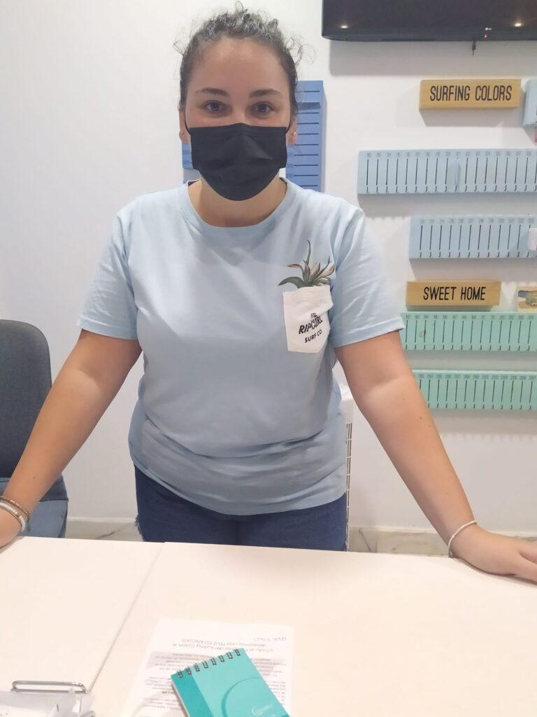Il mio lavoro consiste nella organizzazione delle lezioni di surf, nel chiamare gli hotel, occuparmi dei social media della scuola e anche nel fare piccole pulizie nel locale e nel distribuire volantini agli hotel. Il lavoro mi piace e sono contenta di essere qui!