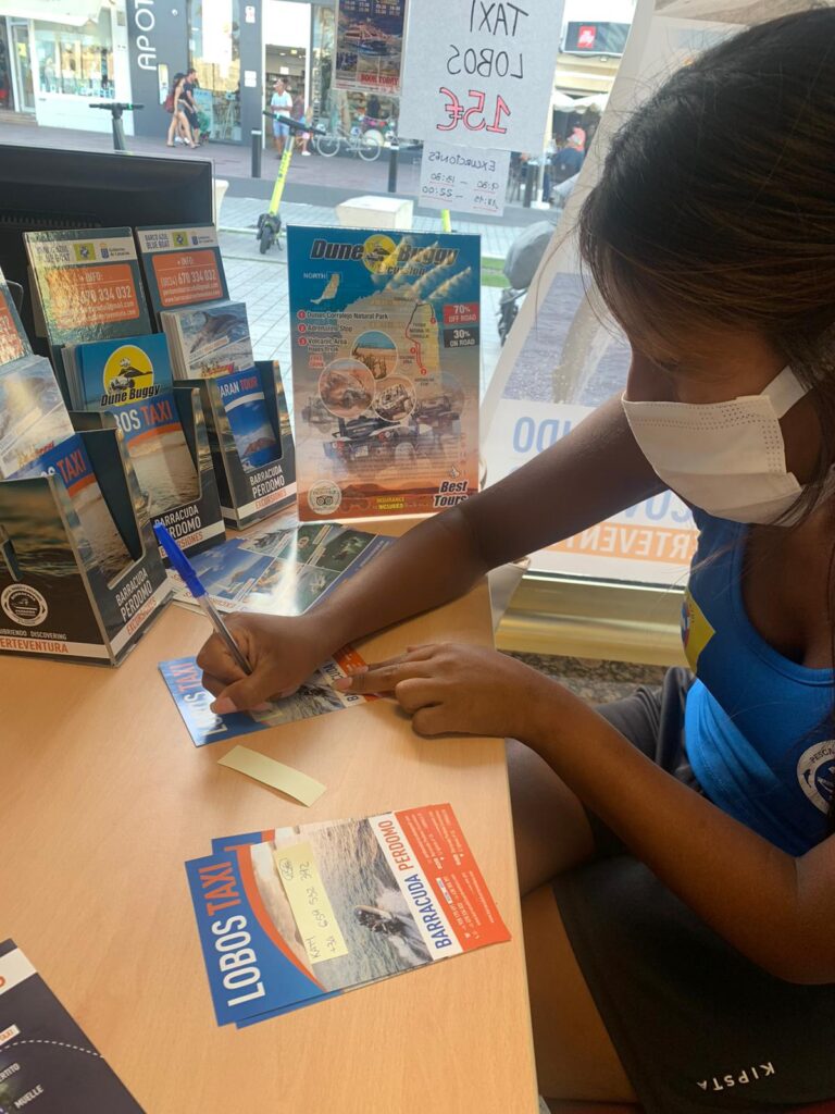 Lavoriamo presso un’agenzia che organizza diverse tipologie di escursioni sull’isola di Lobos. Svolgiamo prevalentemente due mansioni: biglietteria per i turisti e volantinaggio. Il capo e i colleghi sono tutti molto gentili e disponibili con noi, facendoci sentire a nostro agio.