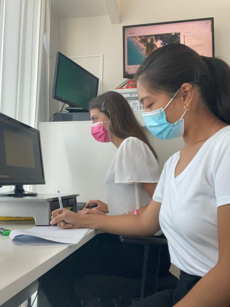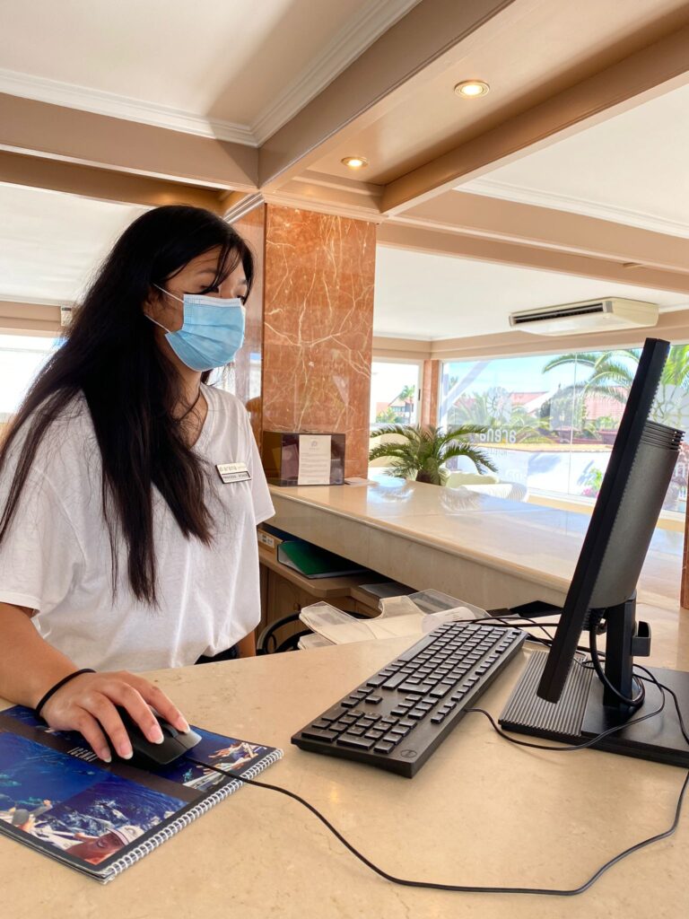 La mia esperienza qui è molto positiva, i clienti sono perlopiù francesi e tutto il personale riesce a comunicare in inglese, quindi contando anche lo spagnolo posso mettere in pratica ben 3 lingue straniere! Lo staff è stato molto gentile e paziente. Mi sono sentita molto a mio agio in questo ambiente, pian piano sto conoscendo sempre di più la struttura dell’hotel. Ho conosciuto diverse figure a partire ovviamente dai receptionists, il capochef del ristorante, la direttrice d’albergo e perfino gli addetti all’housekeeping. Le mie mansioni riguardano un po’ di tutto, nel back-office mi occupo di semplici compiti che riguardano delle scartoffie (per es. stampare certificati vaccinali, fotocopiare documenti per lo staff, organizzare le rooming lists per i giorni seguenti..), nel front-office mi occupo di aiutare i clienti a collegarsi al Wi-Fi, spiego dove si trovano certe strutture, consegno le chiavi delle camere, le chiavi delle cassaforti, gli asciugamani e ho modo anche di prenotare dei taxi. Ciò è solo la punta dell’iceberg di tutto ciò che succede in hotel e non vedo l’ora di continuare quest’esperienza!