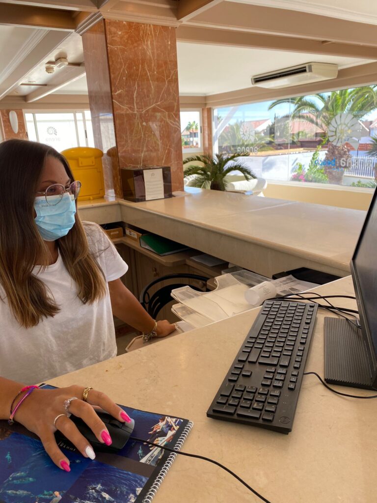 Venice Agustin alla reception e nel back office dell’Hotel Oasis Village di Corralejo